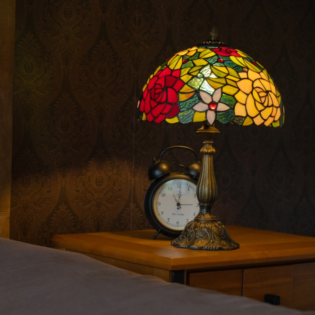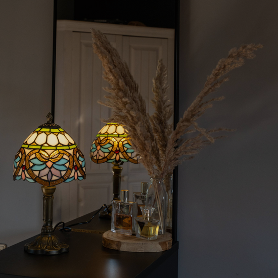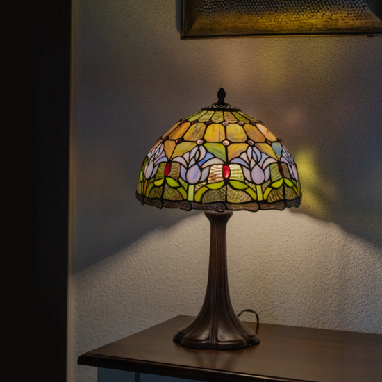 Rond 1900 ontwierp Louis Comfort Tiffany de allereerste exemplaren. Met de hand gesneden stukjes glas-in-lood werden samengebracht met koperfolie en soldeer tot schitterende patronen van bloemen, libellen en geometrische vormen. Zodra het licht aangaat, komt de magie tot leven: warme ambertinten, diepblauw, smaragdgroen en zachtroze dansen door de ruimte.
