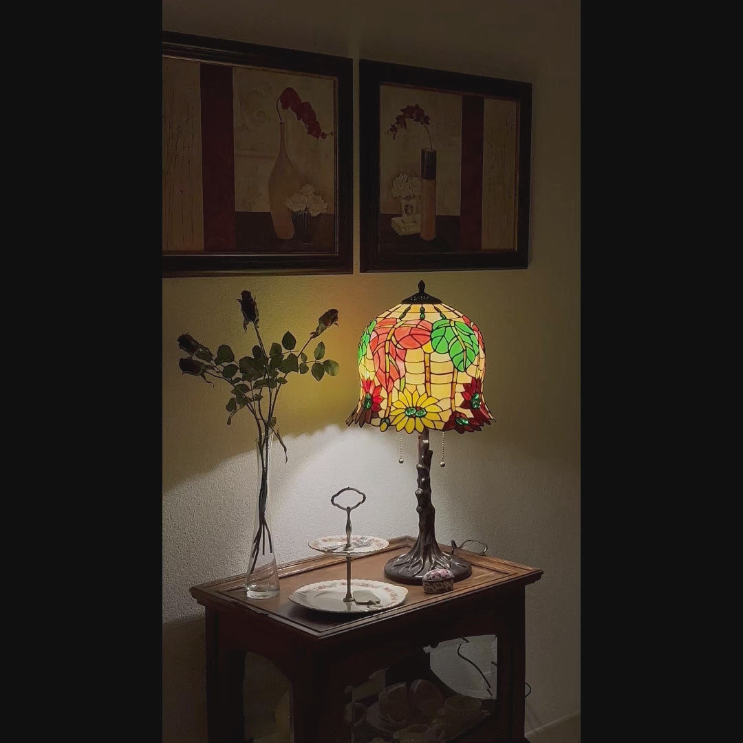 De Tiffany lamp Luminosa is een handgemaakte tafellamp, vervaardigd volgens de officiële Tiffany koperfolie techniek. De ronde kap toont een speels patroon van herfstbladeren in rood en groen, gecombineerd met bloemen in levendig geel. Dit maakt van de Luminosa een echte lamp glas in lood die warmte en kleur brengt in huis. Door haar elegante vorm en stamvormige voet brengt deze lamp de charme van een vintage lamp.