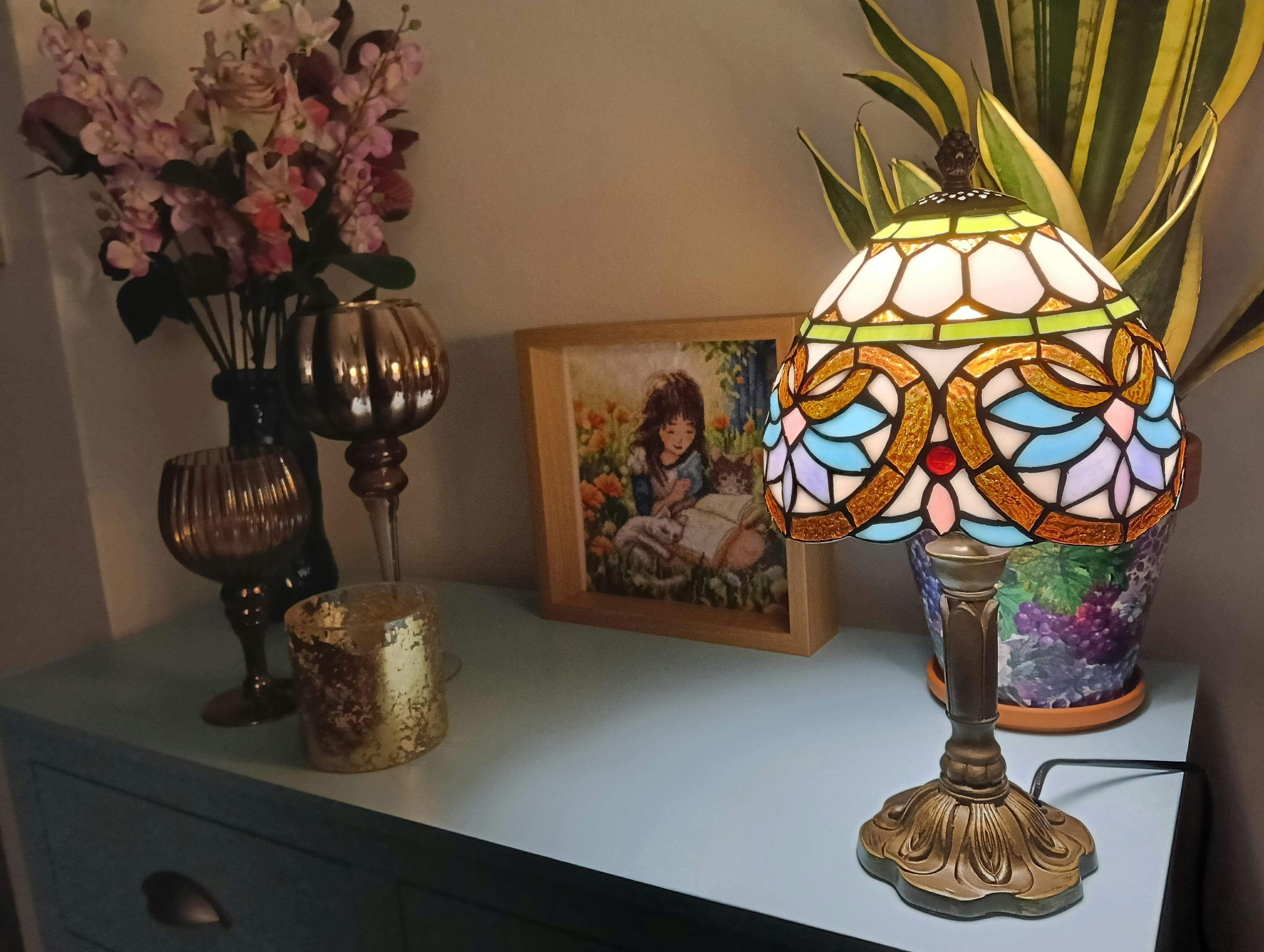 Nee, dit is geen originele Tiffany-lamp, maar een hoogwaardige replica van echt glas-in-lood. Je haalt daarmee wél die warme, nostalgische sfeer in huis, zonder het hoge prijskaartje.