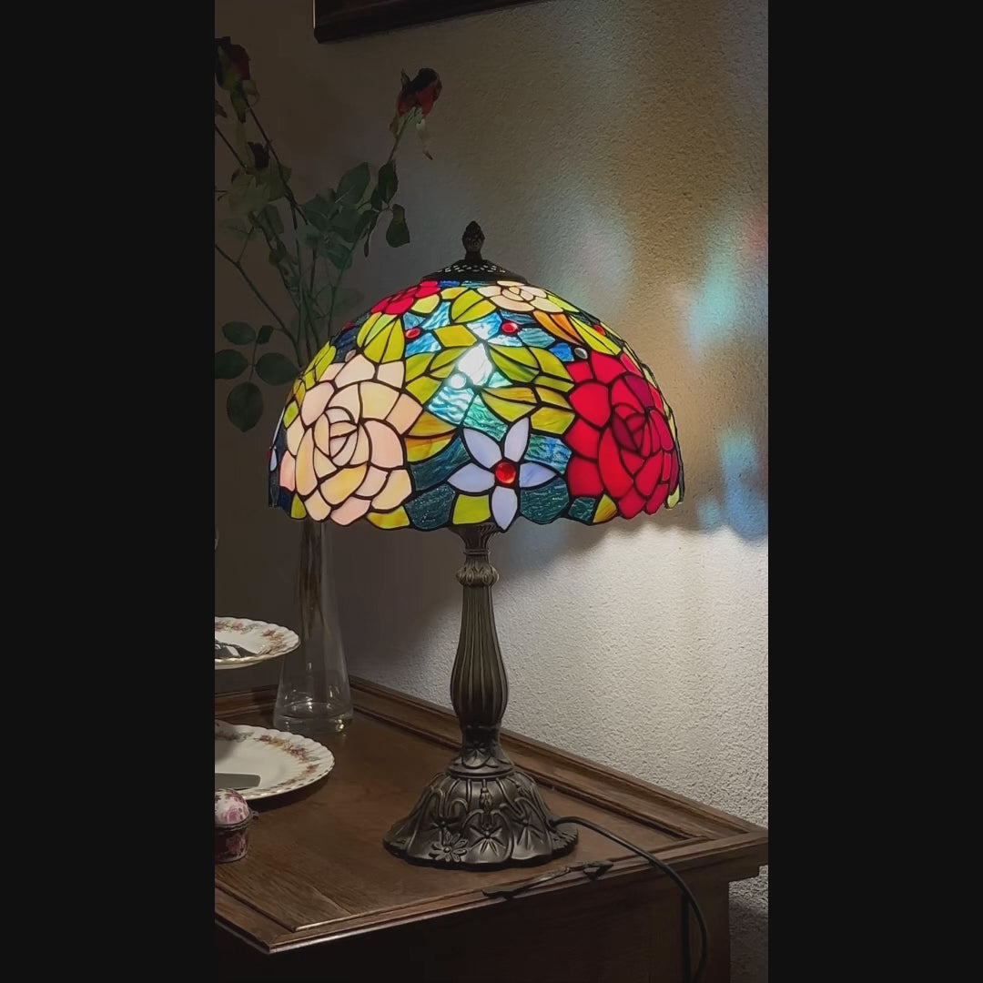 De Tiffany lamp Rosetta is een handgemaakte tafellamp, vervaardigd volgens de officiële Tiffany koperfolie techniek. De kap bestaat uit warme tinten roze, crème en groen, zorgvuldig geplaatst tot een bloemrijk geheel. Zodra je het licht aandoet, lichten de rozen op in een zachte gouden gloed. Daarmee is Rosetta een sfeervolle lamp glas in lood die elegantie en warmte brengt. Dankzij haar grotere formaat combineert ze de grandeur van een Art deco lamp met de tijdloze charme van een vintage lamp.