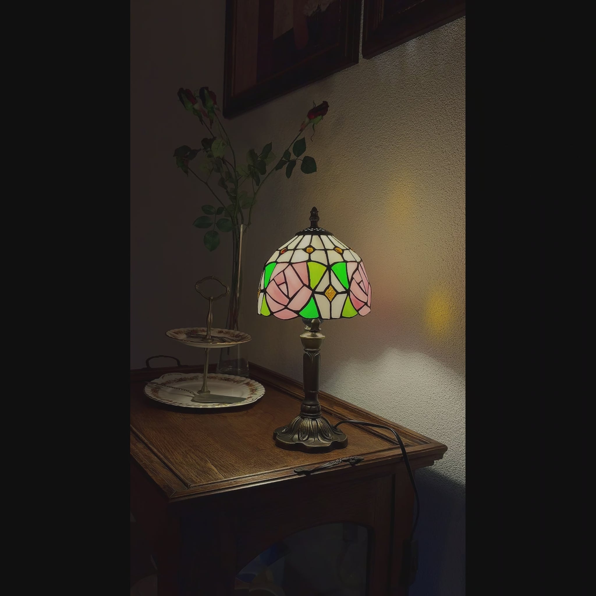 De Tiffany lamp Rosalia Verde is een handgemaakte tafellamp, vervaardigd volgens de officiële Tiffany koperfolie techniek. De kap toont charmante peach-roze rozen, omgeven door groene geometrische bladeren en kleine, schitterende amberkleurige accenten. De cream-witte glasstukken verzachten het licht tot een serene en uitnodigende gloed. Deze lamp glas in lood combineert een bloemrijk ontwerp met een tijdloze uitstraling en vangt de elegante charme van een klassieke vintage lamp.